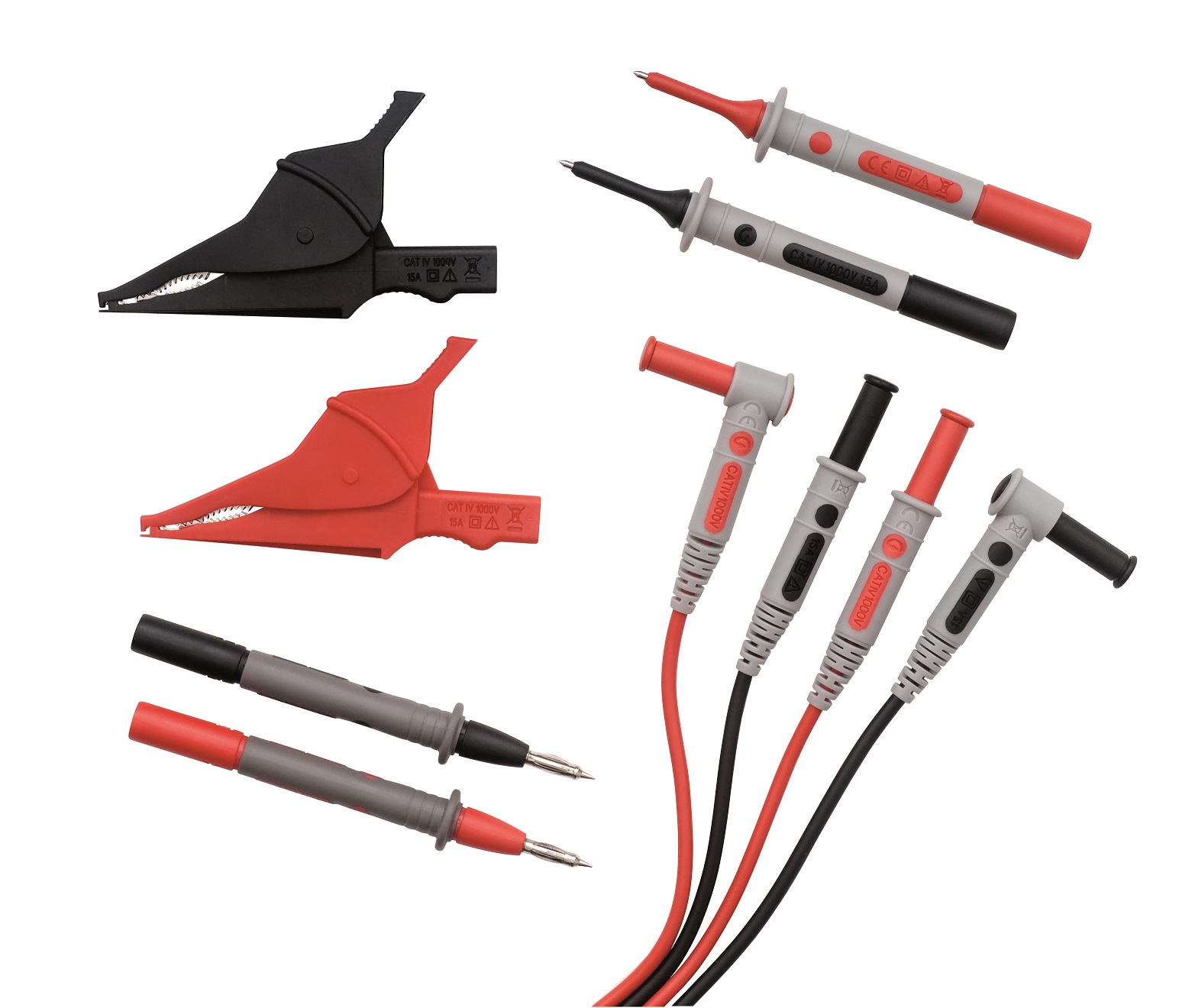 | 1 st Mätsats med 2x krokodil, 2x kabel samt 4x mätprob (2mm+4mm spets) | 1 par Röd/Sv Piercingprob max dia 1,2 mm | 1 par Röd/Sv Magnetprob | 1 par Röd/Sv Liten krokodilklämma | 1 par Röd/Sv Krokodilklämma | |